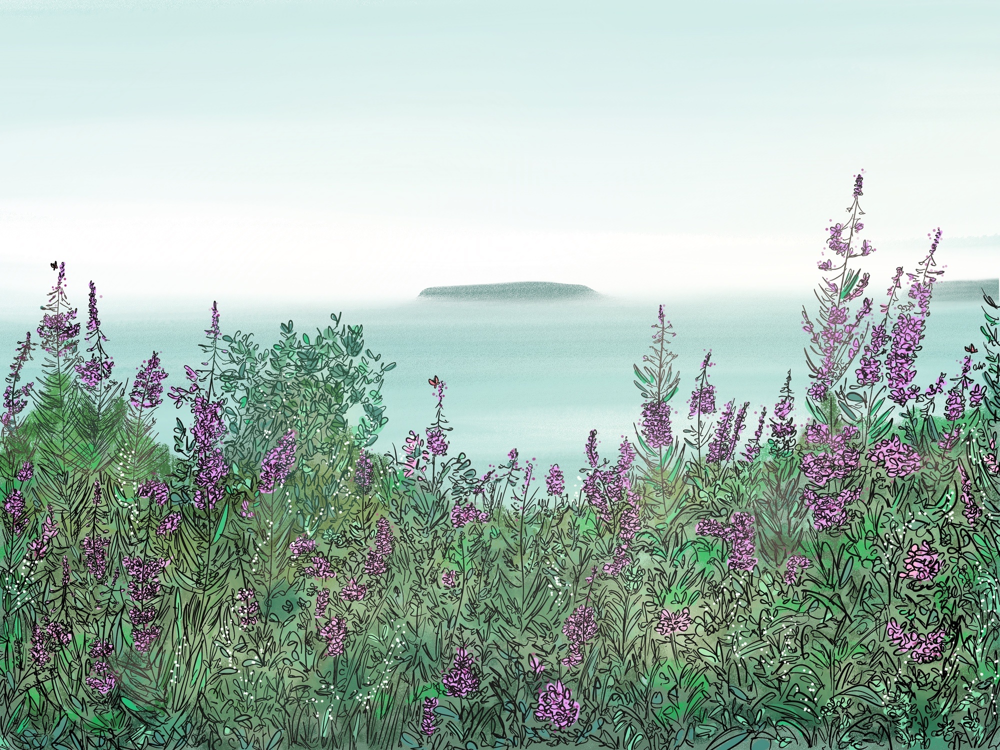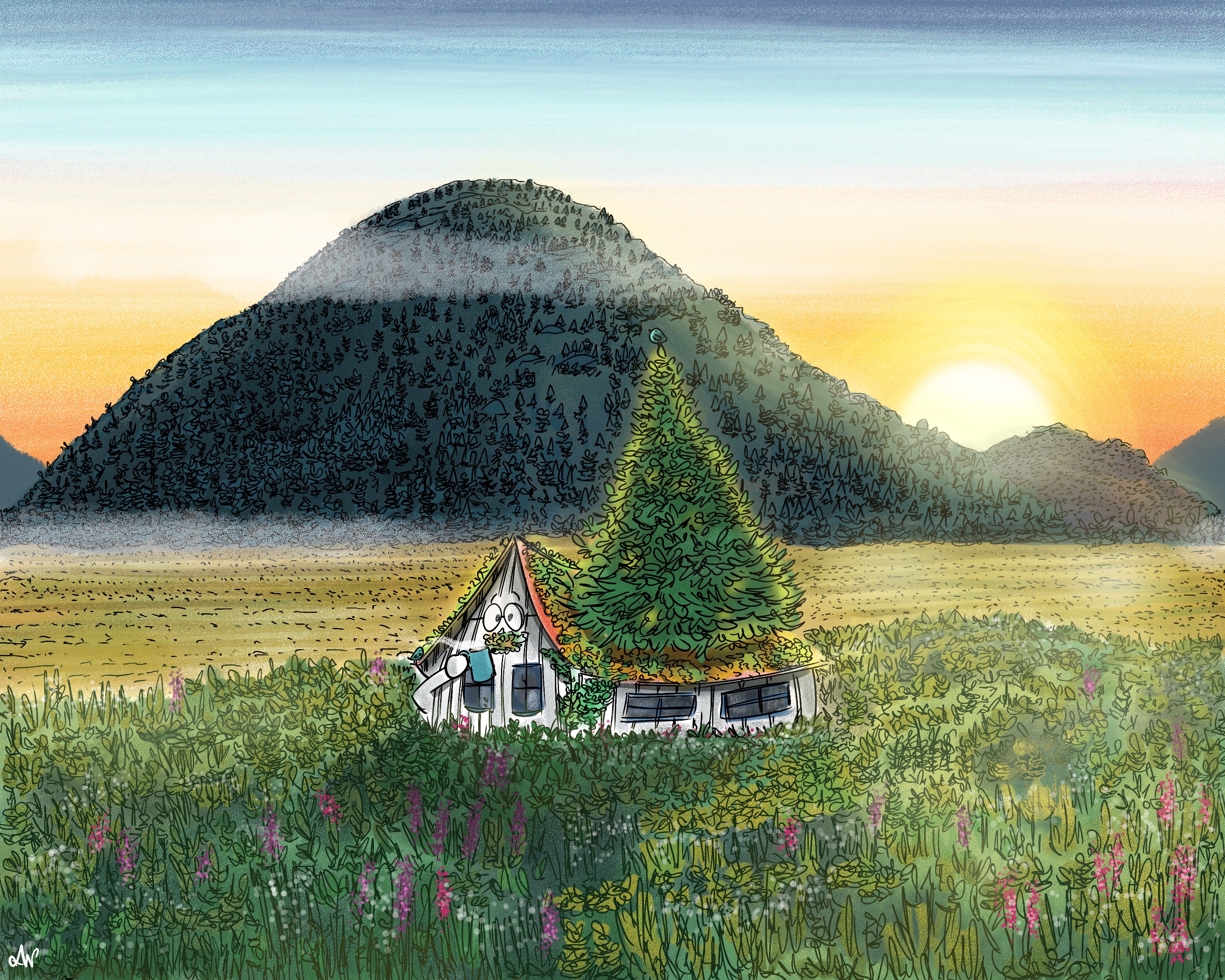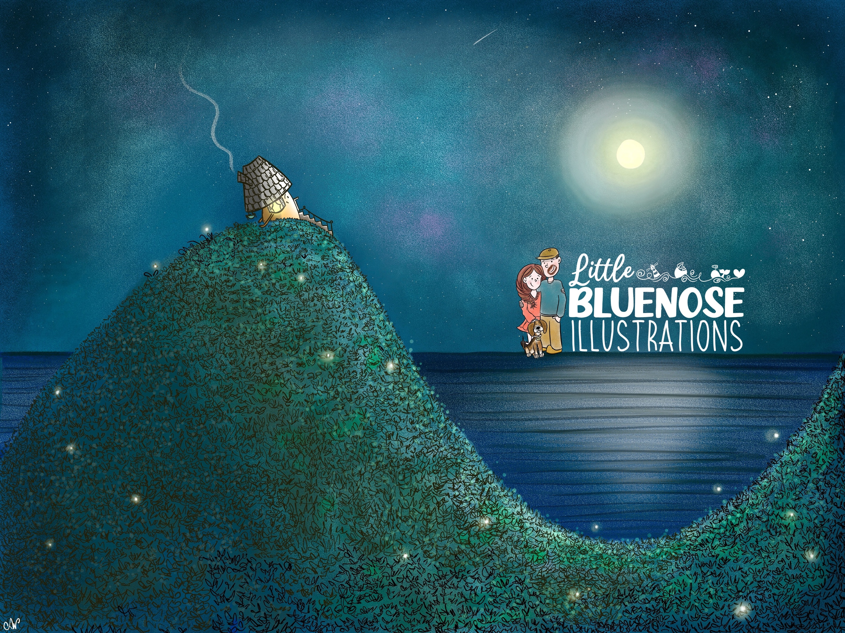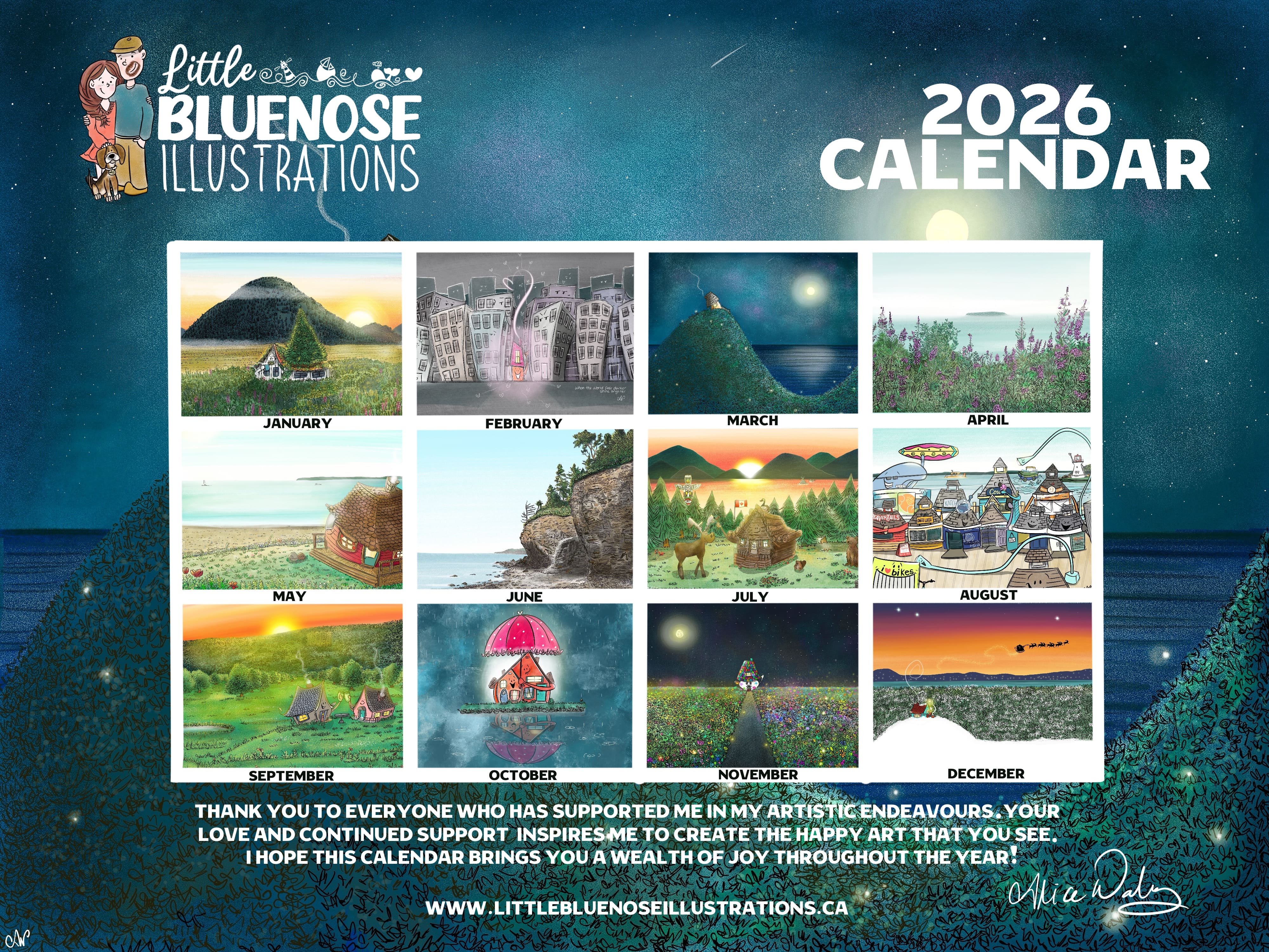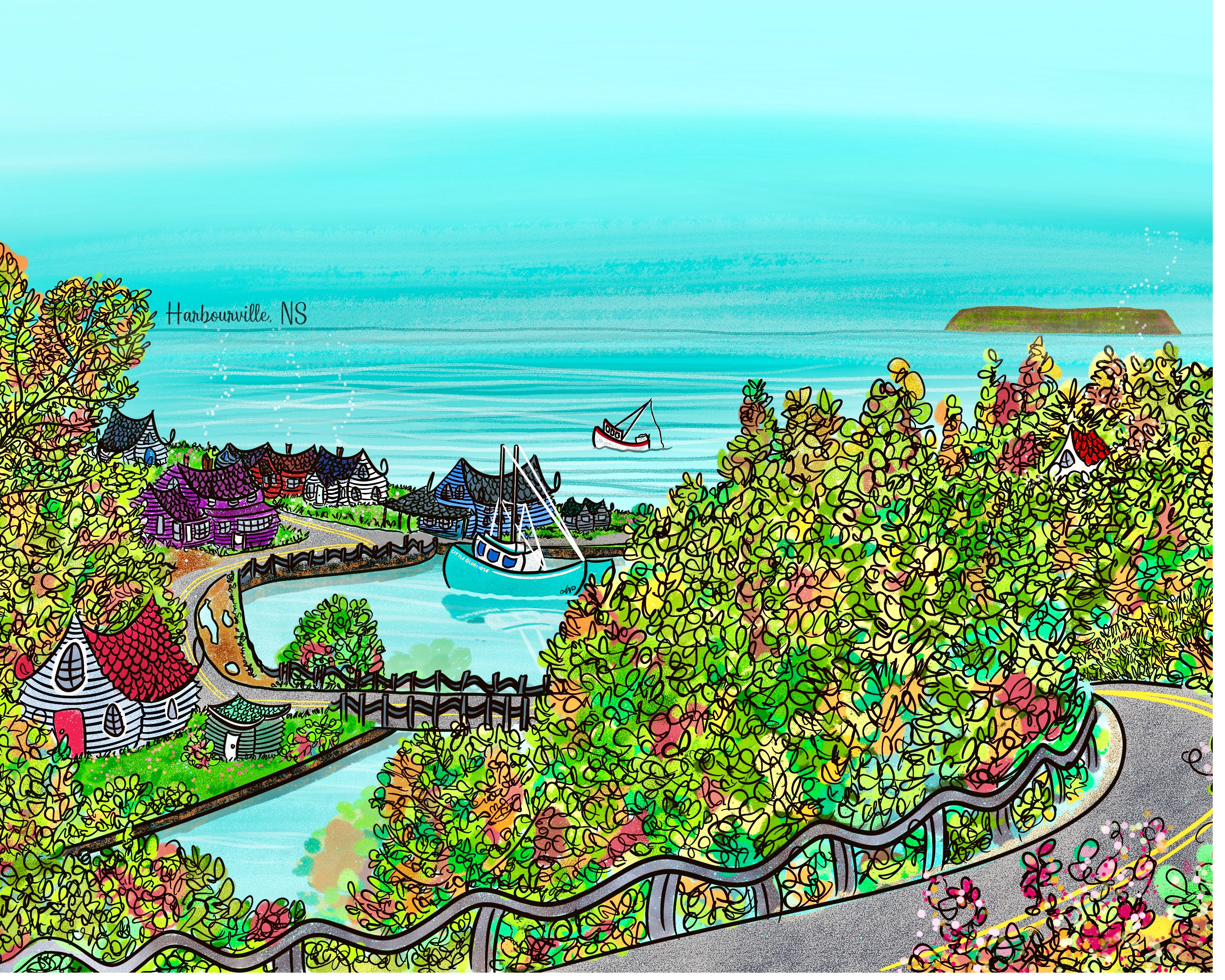 A common theme that runs through my work is highlighting beautiful Nova Scotia landscapes. We have no shortage of inspiration in our province, so there is always a lot to draw from. I also enjoy using a variety of enchanted subjects in my pieces to help capture moments of wonder and delight by mainly transforming ordinary buildings into extraordinary ones. The objective is to pull the viewer inside with subtle humour by giving these houses their own unique personalities.